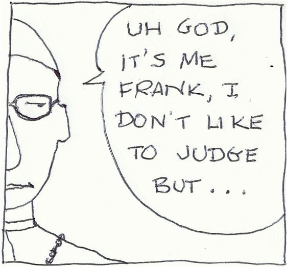 Frank does seem like a solid guy, working hard trying to drag the first estate over to thinking with the left sides of their brains in order to get to the right side of some important issues. It takes a lot of guts to tell your flock that they, god’s signature creation, the one he made in his own image, is primarily responsible for dangerously fouling its planetary nest and putting all of god’s handiwork at risk.