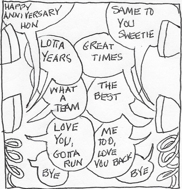 Telebrations of anniversaries are the best of the best. Despite years of marriage these landmarks are still freighted with outmoded expectations: romantic gestures, tokens of love, civility. Telebrations allow you to limit all of those tedious exercises to a few minutes, ten max, and even MJE can manage that. I do like to have the telebratory call or calls timed to coincide with my first bloody mary in the morning and or my second or third cocktail in the evening, or afternoon, depending. I find that I am much more amiable when my blood alcohol level is elevated.