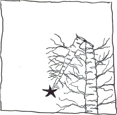 The solution: a prosthetic peak. If Michael Jackson could have a nose tip created, anything is possible. So MJE whacked off most of the back branches (with bonus points for shaping the leftovers into a right angle so as to fit more snugly into the corner), bound them together with packing tape and wired the assorted shrubbery to the remains of the trunk. From a distance, at the right angle without glasses it was perfect. Sadly the ersatz pinnacle lacked the necessary oomph to hold up the tree’s shining star. It drooped like, uh, well you do the visual. Something more muscular was called for. A stout stick provided the proverbial lead in the pencil and a star was borne.